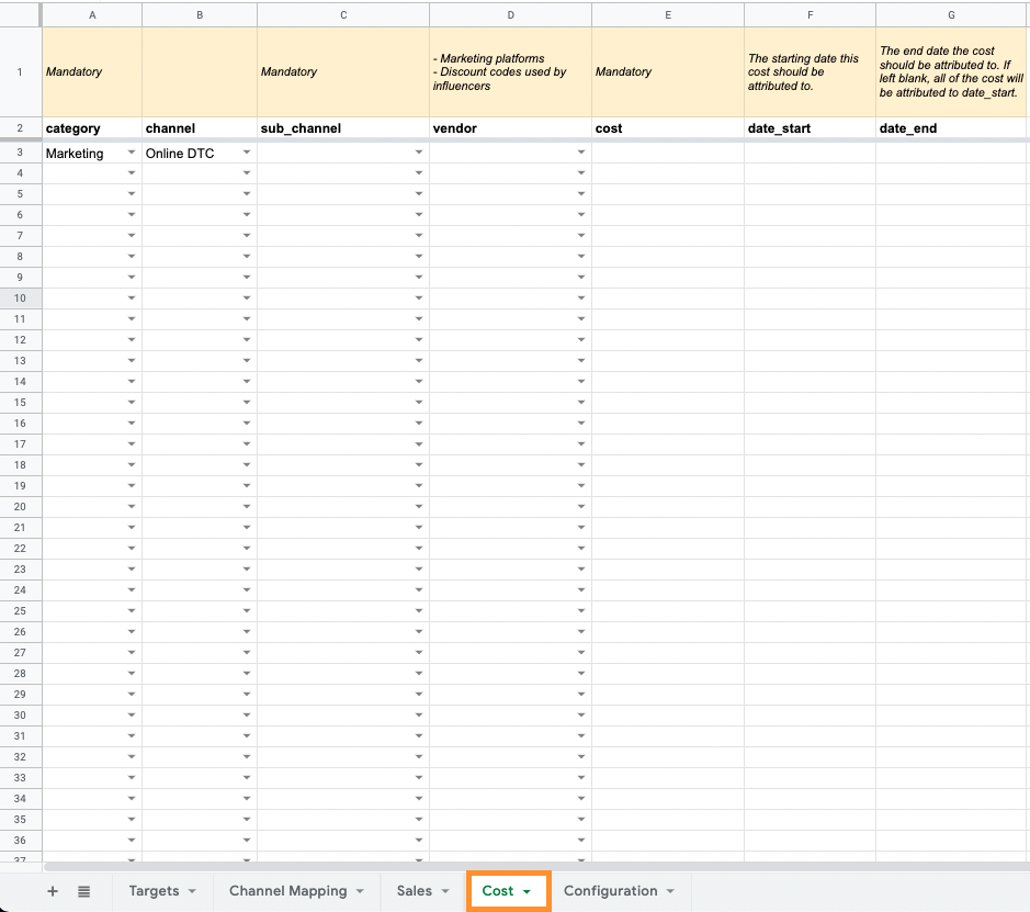Costtab, select the appropriate values for each columncategory- selectMarketingchannel- select the channel where you’re expecting to see returns on this spend (Online DTC, Wholesale, etc.)sub-channel- select the sub-channel that the spend is associated with (new sub-channels can also be added within theConfigurationtab)