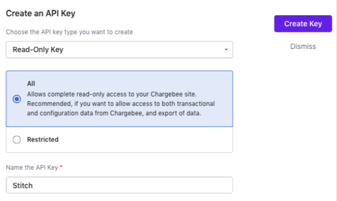 - Select All to define the API key’s access. This will grant read-only access to your Chargebee site
