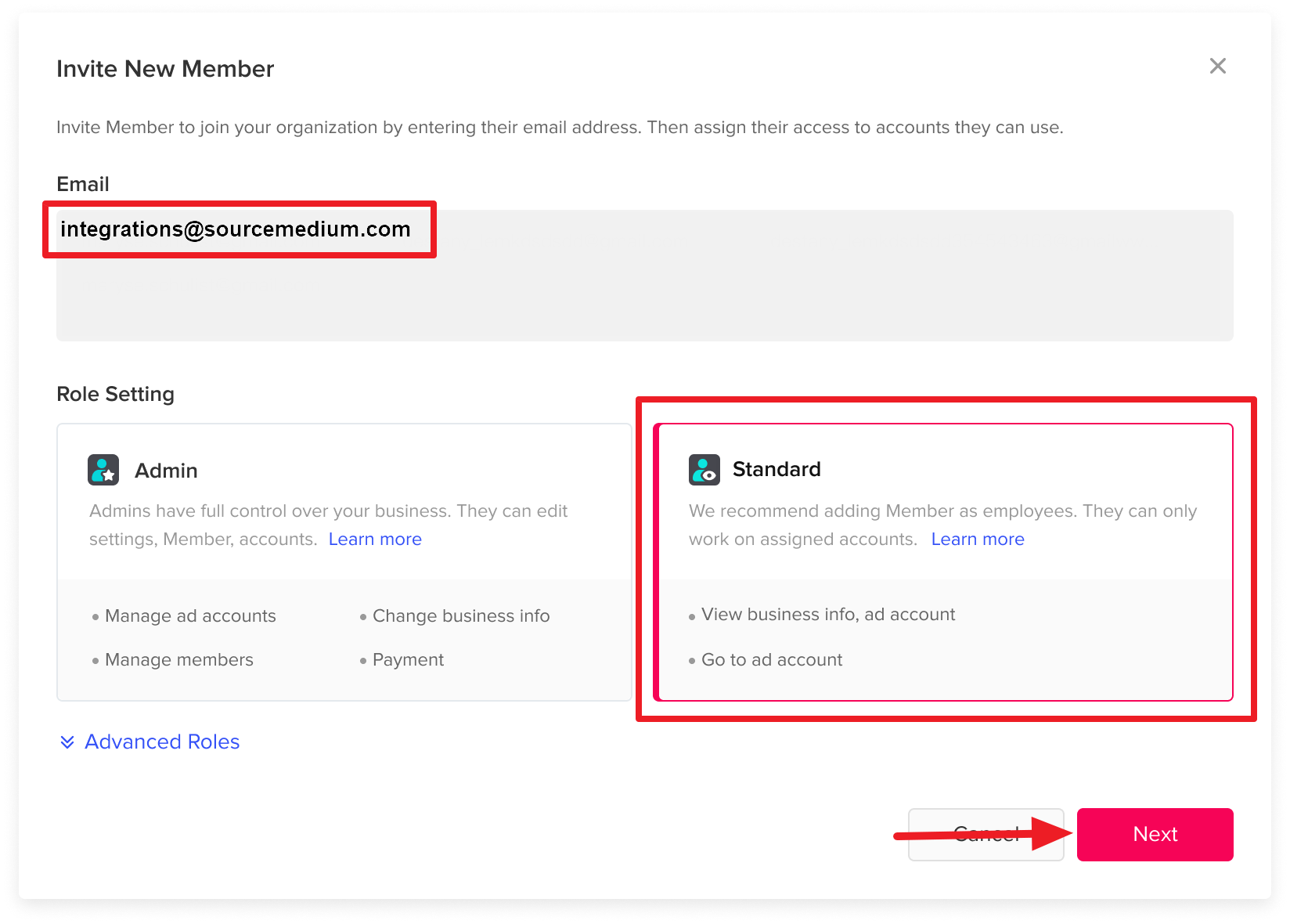 - Invite SourceMedium as a member to your TikTok Business account