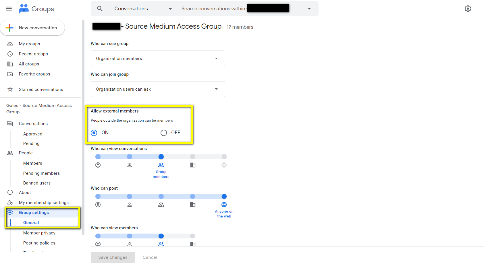 - Once you have named the group and set the privacy settings, you can add group members by adding emails in the Group Members box. Once you have added the emails of those you want to join the group, hit Create group.