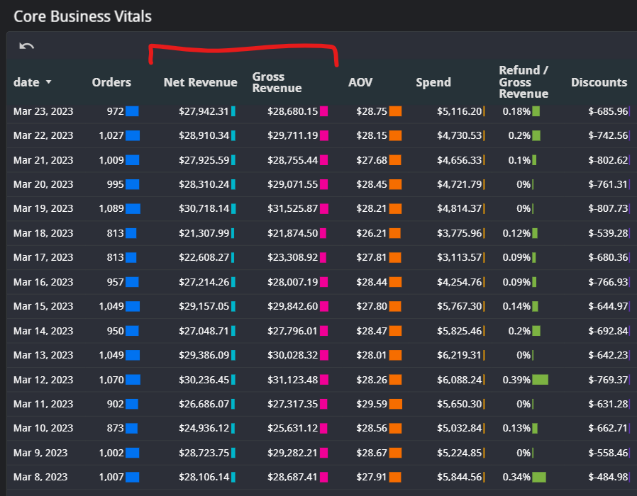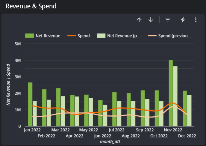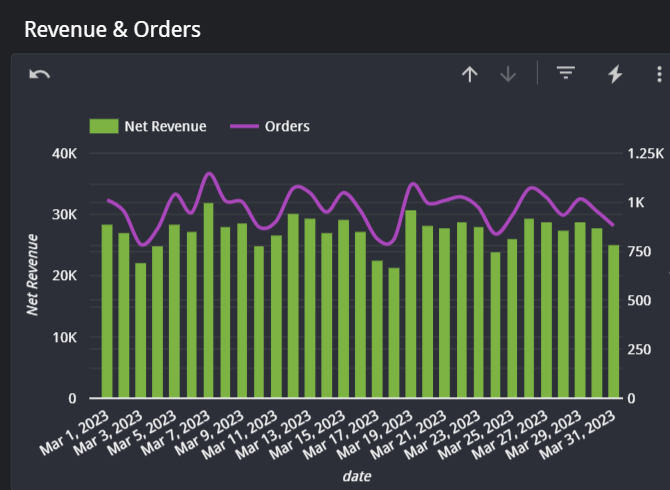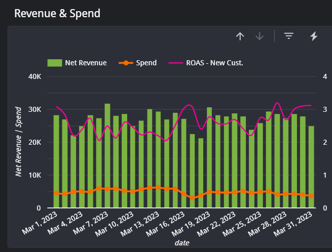 As always, make sure to check your channel and date filter to make sure you are looking at Amazon data from your desired period. On this page you find a collection of core metrics about your sales and customers. The first chart will show net and gross revenue by day. You can change this to by week, month, quarter, or year using the drill-up and drill-down buttons on the top right of the chart.