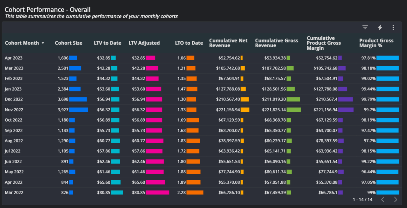 Checking in on KPIs like Net Revenue or ARPC is the simplest way to get a sense of the health of your business and the efficiency of your operations. You may want to identify sales KPIs for Amazon and have us create scorecards, or synchronize your team through automated weekly emails, for example.Understanding Lifetime Value of Amazon Cohorts