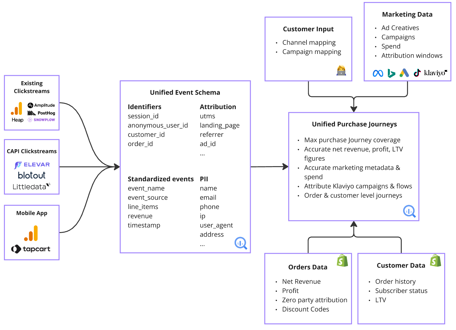 - The Unified event Schema is combined with Marketing Data, Orders Data, Customer Data, and User Inputs using the appropriate identifier matching for each to create a set of Unified Purchase Journeys which you’ll see on the right-hand side of the chart